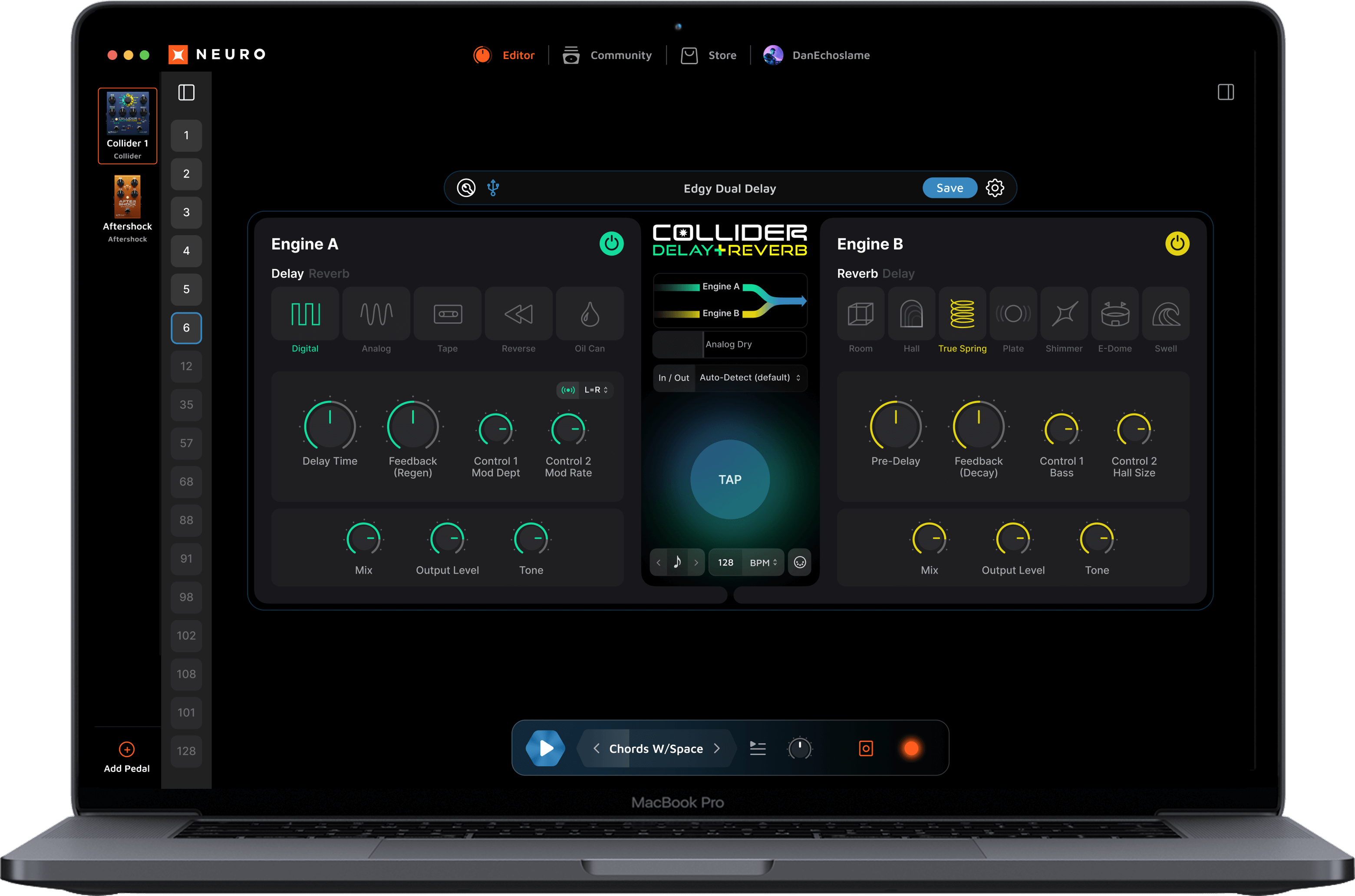 Select between true bypass, buffered bypass, or soft bypass with reverb trails. The Collider features high-quality signal relays for true bypass and transparent buffers for analog bypass.